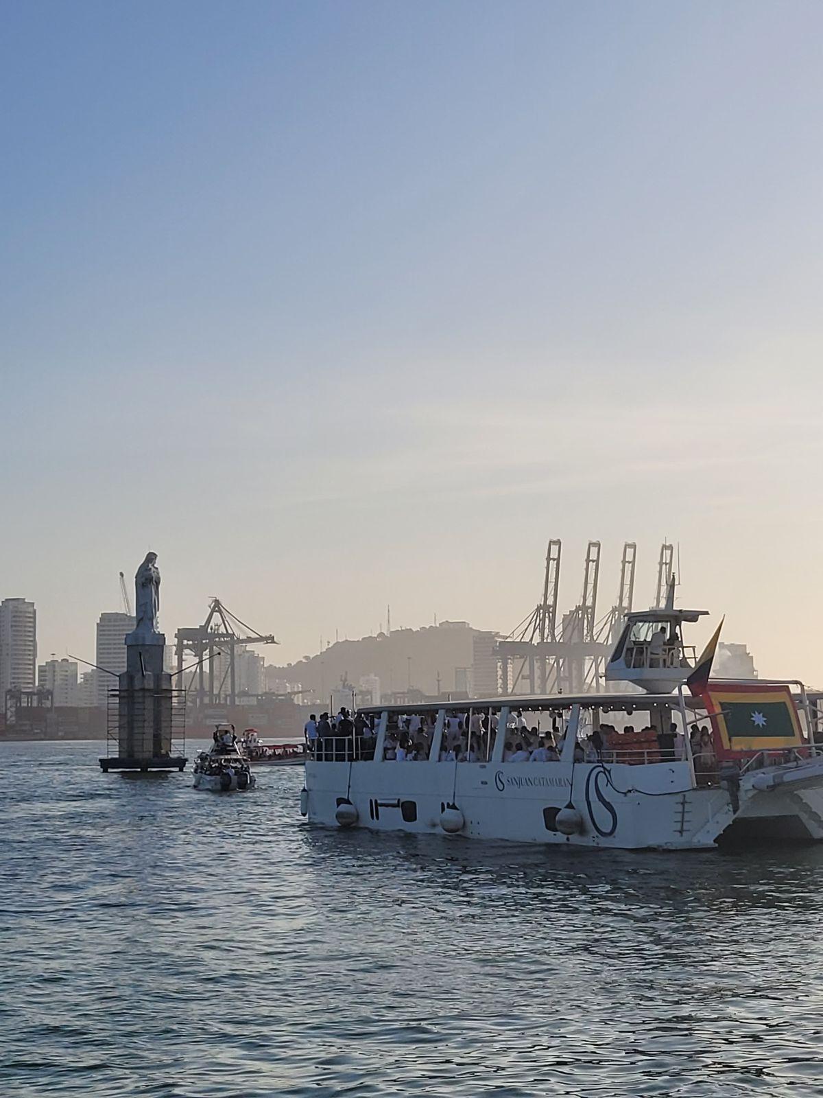 [A esta hora] Al despuntar la aurora, inició en la bahía de Cartagena de Indias la Alborada Náutica en honor de la Virgen del Carmen, la cual cobra especial relevancia luego del ingreso reciente de la ciudad en la Red Mundial de Destinos Turísticos Religiosos.