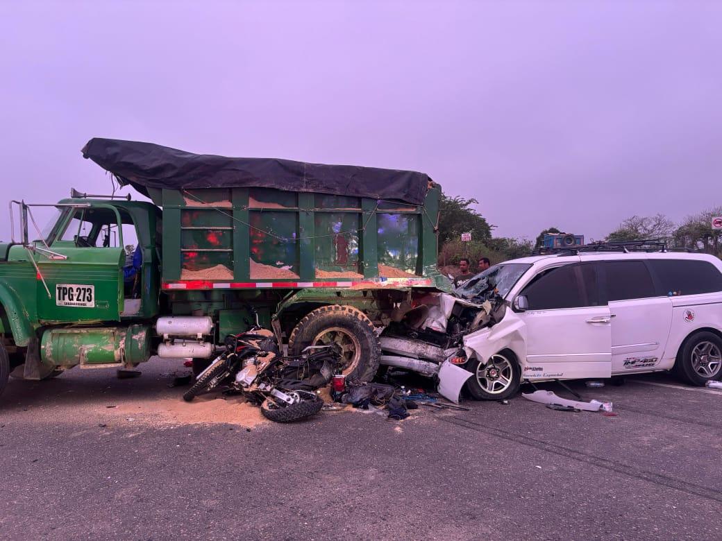 El fuerte golpe lo recibieron la vans y la motocicleta en la parte delantera con la parte lateral izquierda de la volqueta.