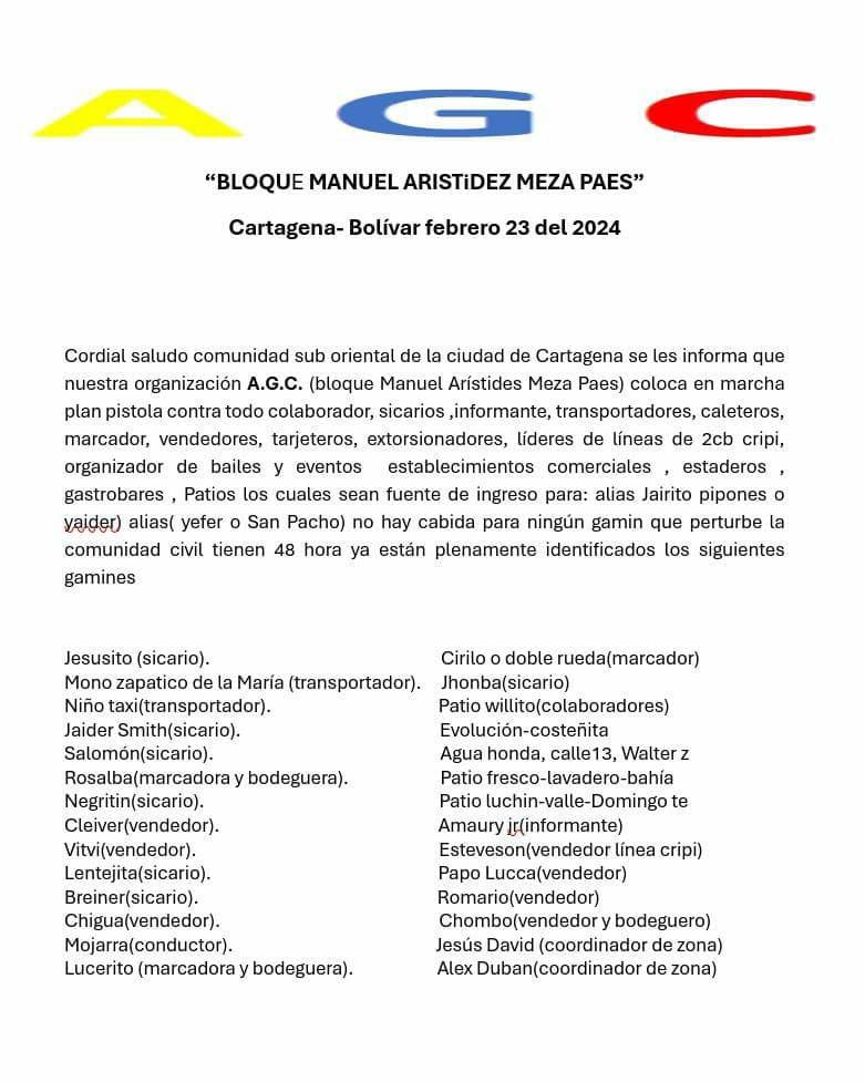 El documento, que circula en redes sociales, aparece con fecha del 23 de febrero del año en curso y de autoría del bloque Manuel Arístides Meza Paez, de las Autodefensas Gaitanistas de Colombia, anunciando un plan Pistola para la ciudad.