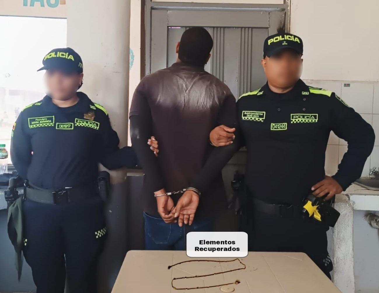 El capturado, conocido como ‘el Oswaldo’, fue sorprendido huyendo del lugar de los hechos, practicándole un registro personal, donde se le encuentra una cadena de oro, avaluada en 5 millones de pesos, la cual había sido hurtada minutos antes a una mujer.