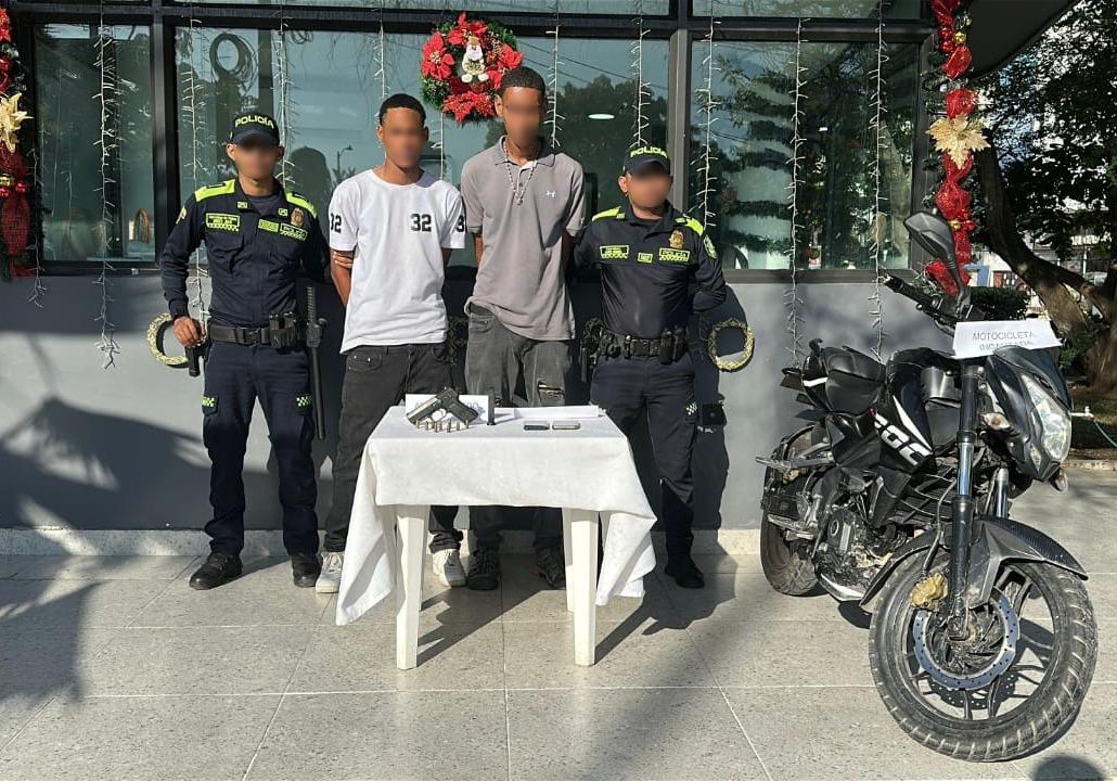 La acción se registró sobre la avenida Santander, donde patrullas de vigilancia interceptaron a dos sujetos que se movilizaban en una motocicleta y que, al parecer, pretendían cometer un hurto en el sector. Durante el procedimiento fueron capturados alias ‘el Jose’, de 21 años, y ‘el Jeiner’, de 18.