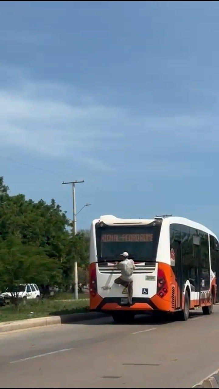 El Departamento Administrativo de Tránsito y Transporte, DATT, invita a todos los actores viales en Cartagena, a tener comportamientos responsables en la vía. Como Autoridad de tránsito en la ciudad, que vela por el derecho a la vida, rechazamos la peligrosa maniobra del señor que viaja en la parte trasera del Transcaribe, poniendo en riesgo su vida y la de los demás.