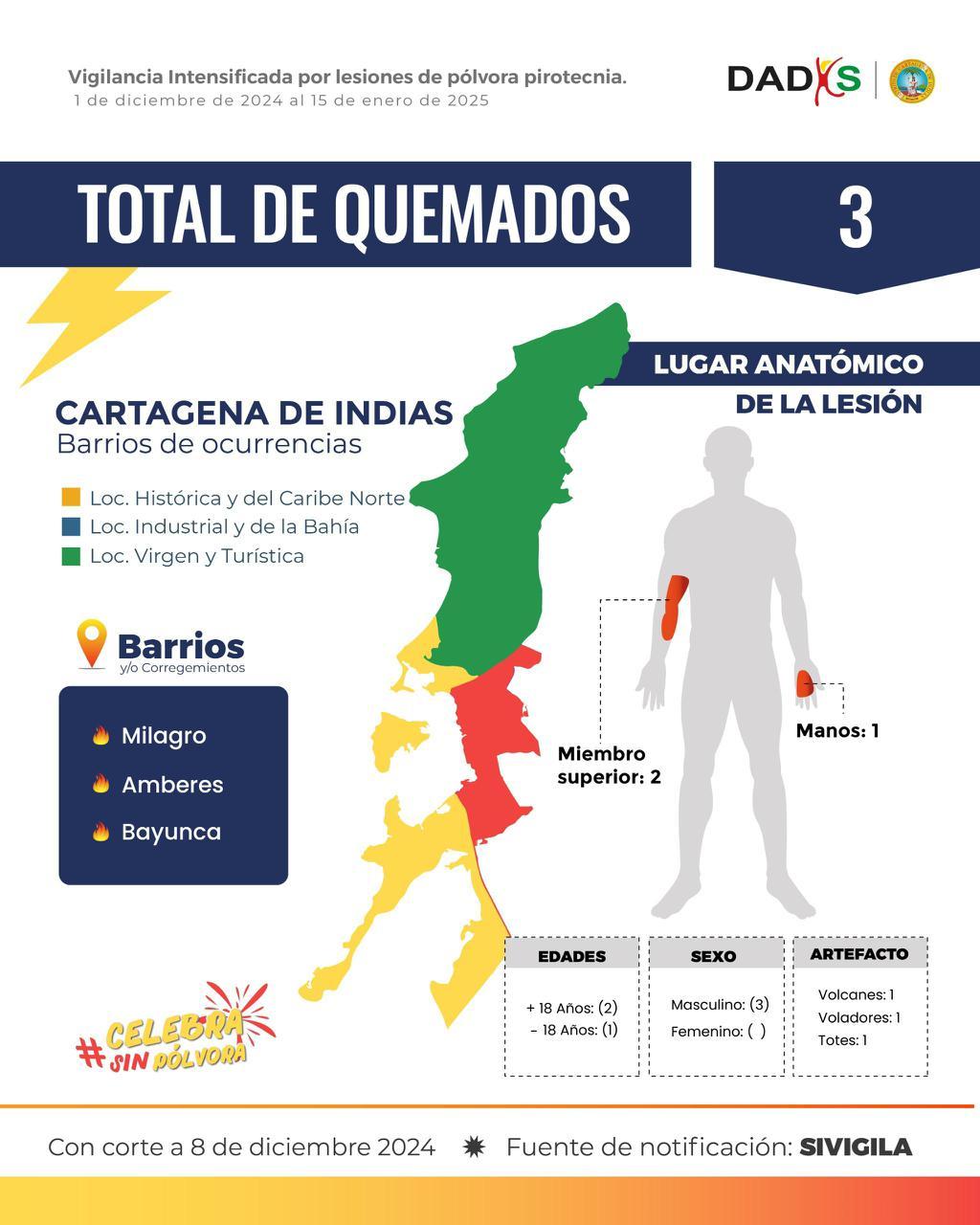 Los casos se registraron en los barrios Amberes y El Milagro, además del corregimiento de Bayunca. Los tres lesionados, todos de sexo masculino, sufrieron quemaduras en miembros superiores y manos por la manipulación de elementos como: volcanes, voladores y totes o traqui-traquis.