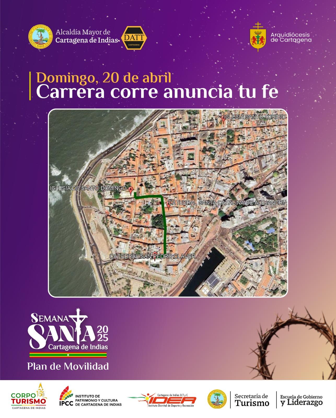 Debido a la realización del evento deportivo “Corre y Anuncia Tu Fé 2025″, en los circuitos 5K y 10 K , el Departamento Administrativo de Tránsito y Transportes, DATT, determinó algunos cierres temporales en algunas vías del Centro Histórico, Getsemaní y San Diego , durante este domingo 20 de abril entre las 6:00 a.m y las 8:00 a.m