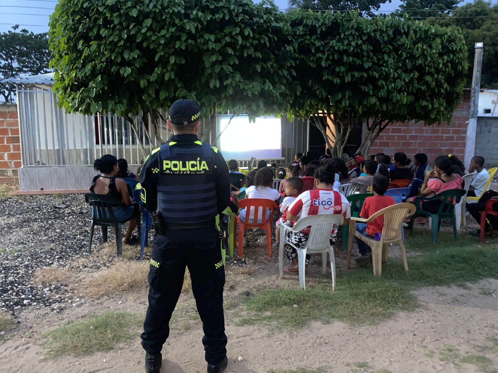En la hora fresca y tranquila de la noche, el telón improvisado se convirtió en ventana. Niñas y niños, con los ojos brillantes y los pies descalzos de rutina, se sentaron frente a una historia proyectada en luz. Allí, en medio del calor tropical y la alegría sencilla, la Policía Nacional encendió algo distinto: el fuego del encuentro.