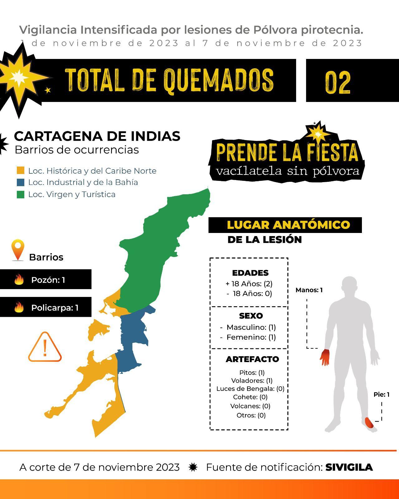 Durante el fin de semana, el Programa de Vigilancia y Salud Pública reporta, a través del SIVIGILA, a corte de 7 de noviembre, dos casos de lesionados con pólvora, se trata de dos personas adultas que tuvieron que recibir atención médica en diferentes centros asistenciales de la ciudad.