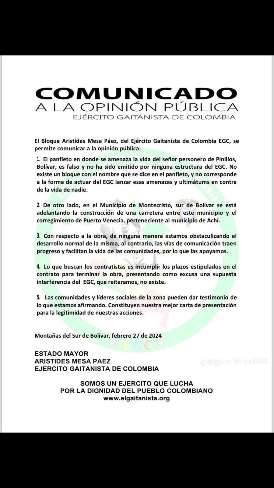 En un comunicado que aparece firmado por el Estado Mayor del Ejército Gaitanista de Colombia y del Bloque Arístides Meza Paez se dio a conocer que ellos no han amenazado al actual Personero del Municipio de Pinillos, en el departamento de Bolívar.