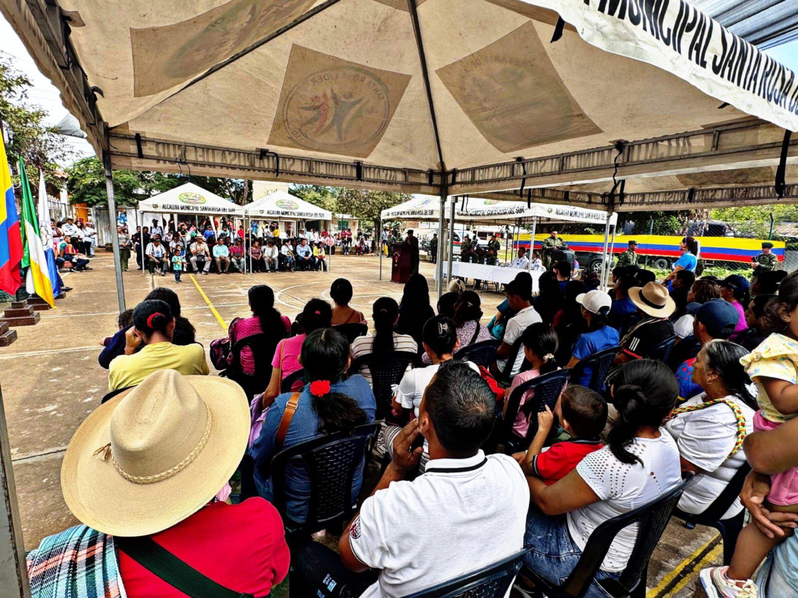 Soldados de la Primera División del Ejército Nacional de Colombia, a través del Batallón de Selva Número N.°48, el Batallón de Acción Integral y Desarrollo Número N.°1 y los Profesionales Oficiales de la Reserva en coordinación con la Gobernación de Bolívar y la Alcaldía Municipal de Santa Rosa del Sur, llevaron a cabo una Jornada de Apoyo al Desarrollo en la vereda San Benito ubicado en el municipio de Santa Rosa del Sur, en el departamento de Bolívar.