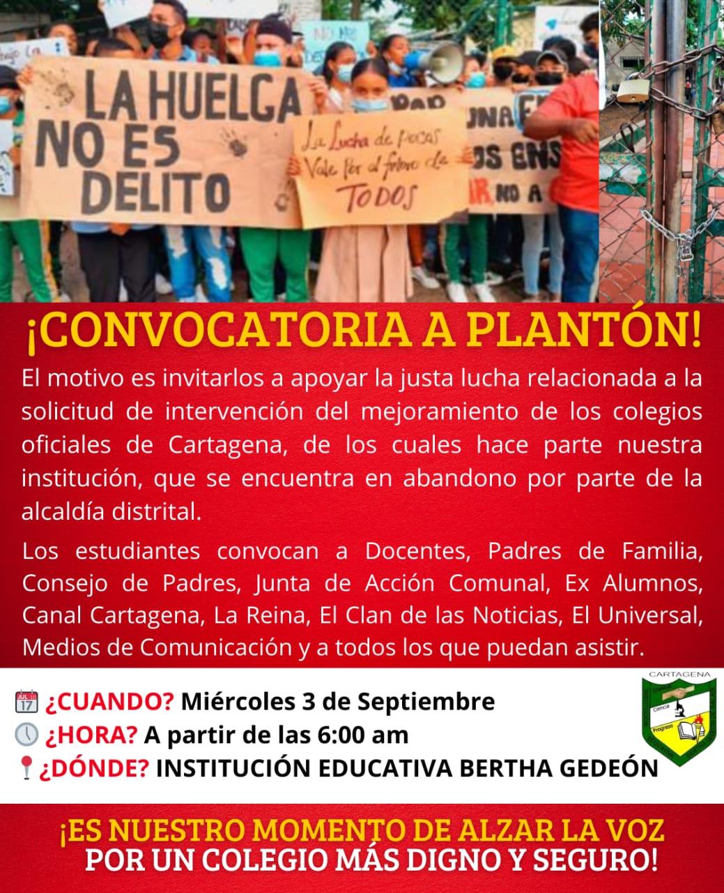 Un grupo de estudiantes de la Institución Educativa Bertha Gedeón convocó a un plantón para este miércoles 3 de septiembre, a partir de las 6:00 de la mañana, con el fin de exigir la intervención y mejoramiento de los colegios oficiales de Cartagena, los cuales, según denuncian, se encuentran en estado de abandono por parte de la administración distrital.