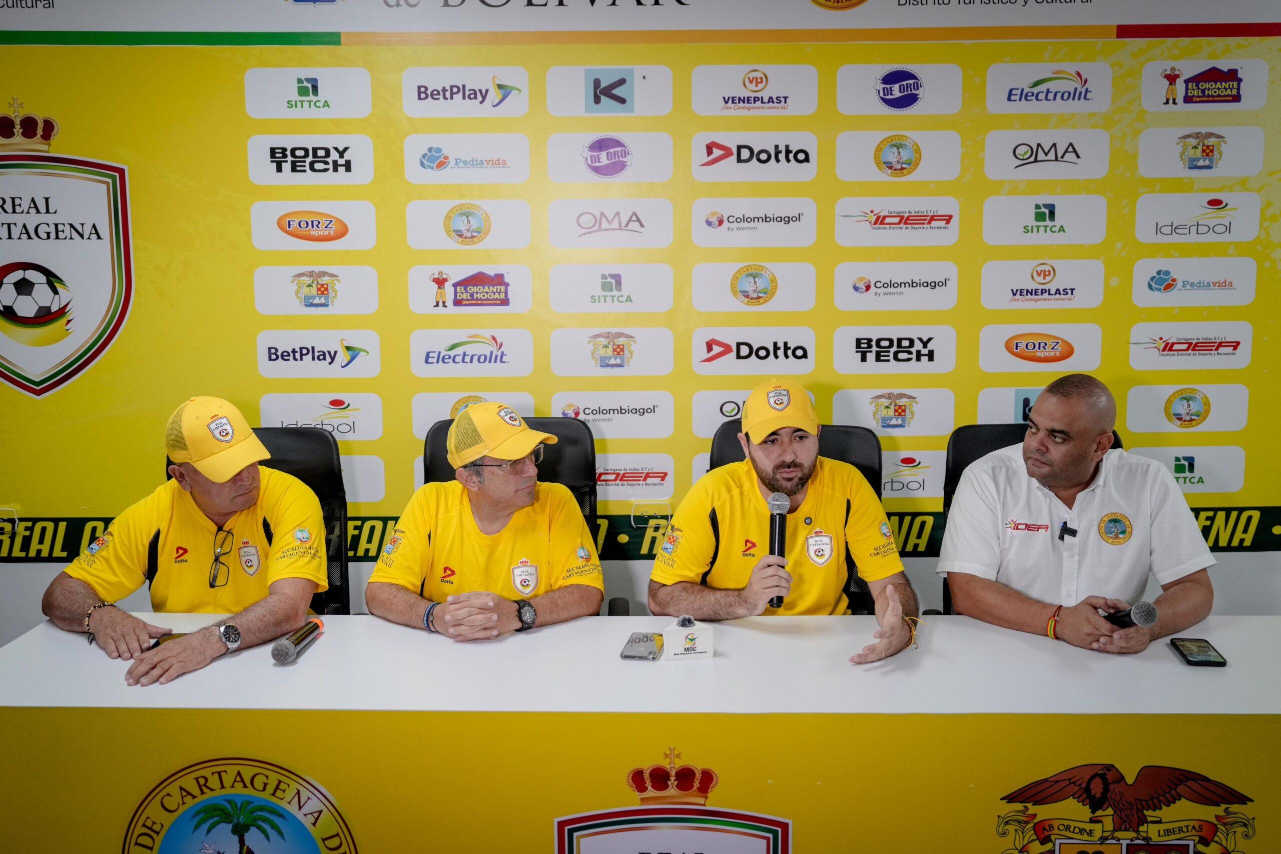 El gobernador de Bolívar, Yamil Arana Padauí, junto al cuerpo técnico del Real Cartagena, anunció este sábado en rueda de prensa la incorporación de seis nuevos jugadores para el Torneo Betplay Dimayor II 2024.