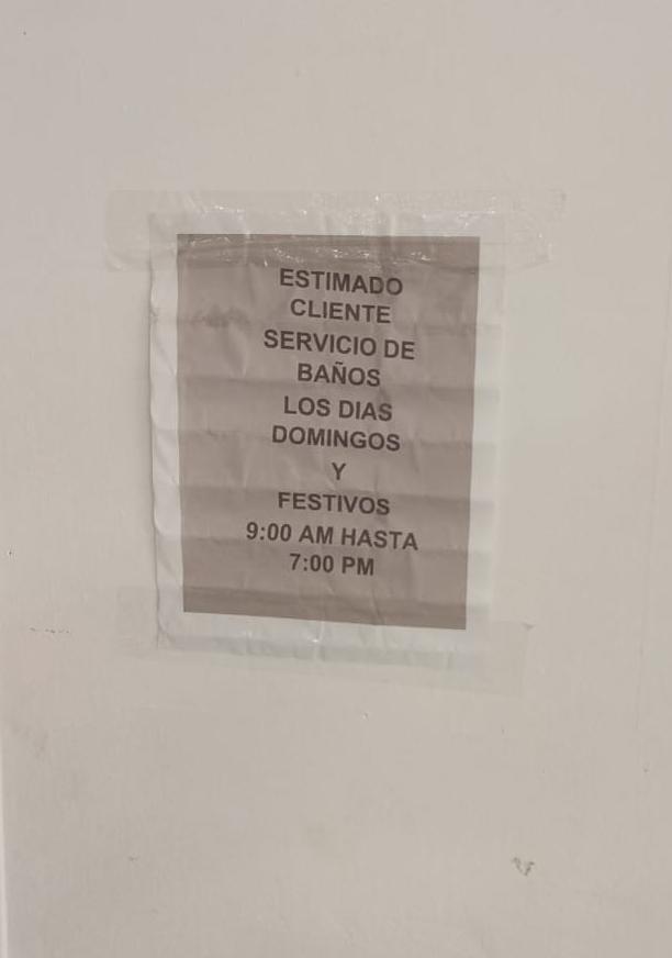 Una situación indignante se registró este domingo alrededor de las 8:15 de la noche en el almacén Éxito Centro, cuando varias mujeres —entre ellas niñas— ingresaron con la intención de utilizar el baño y se encontraron con un aviso que informaba que el servicio sanitario solo se presta hasta las 7:00 p. m. los domingos y festivos, aun cuando el establecimiento permanece abierto hasta después de las 8:30 p. m