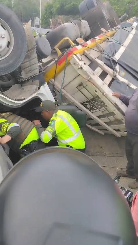 Falla mecánica provocó volcamiento de tractocamión en la Troncal de Occidente; uniformados de Tránsito y Transporte actuaron de inmediato.