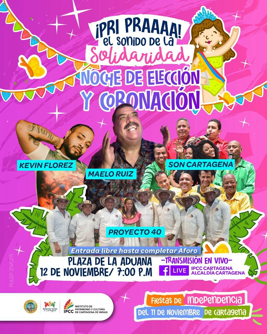 Proyecto 40, grupo folclórico ganador de la convocatoria Impulso; Son Cartagena, de folclor orquestado; el gran artista salsero Maelo Ruiz, y Kevin Flórez, representante de la champeta, pondrán el toque musical y festivo a los asistentes.