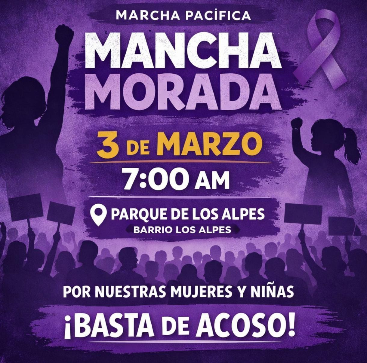 Bajo el nombre de “Mancha Morada”, la marcha pacífica se realizará el próximo 3 de marzo de 2026 a las 7:00 de la mañana, con punto de partida en el Parque de Los Alpes.