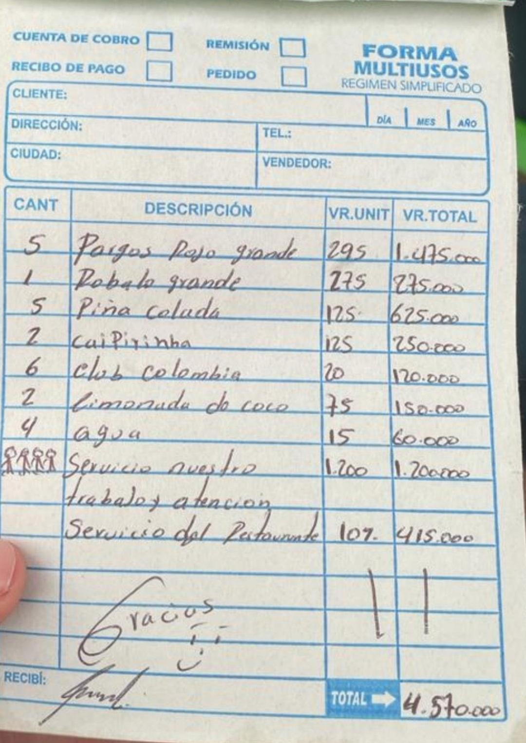 A estas personas les cobraron $1.475.000 por cinco pargos, $275.000 por un robalo, $625.000 por cinco piñas coladas, $120.000 por 6 Club Colombia, entre otros productos.