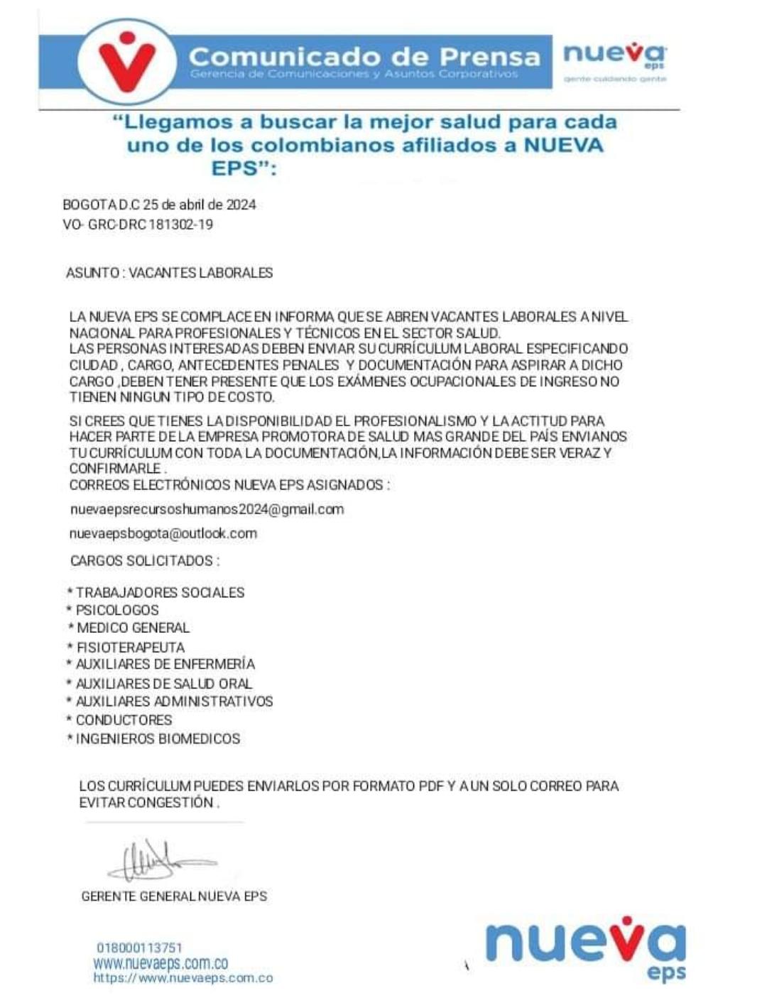 En la comunicación más reciente y que involucra un formato habitual de envío de información de la Empresa, realizan una falsa convocatoria laboral para diferentes cargos en salud, que, si bien inicialmente no parece tener cobros, posteriormente pueden facilitar prácticas ilegales por lo que NUEVA EPS invita hacer caso omiso de este tipo de ofertas.