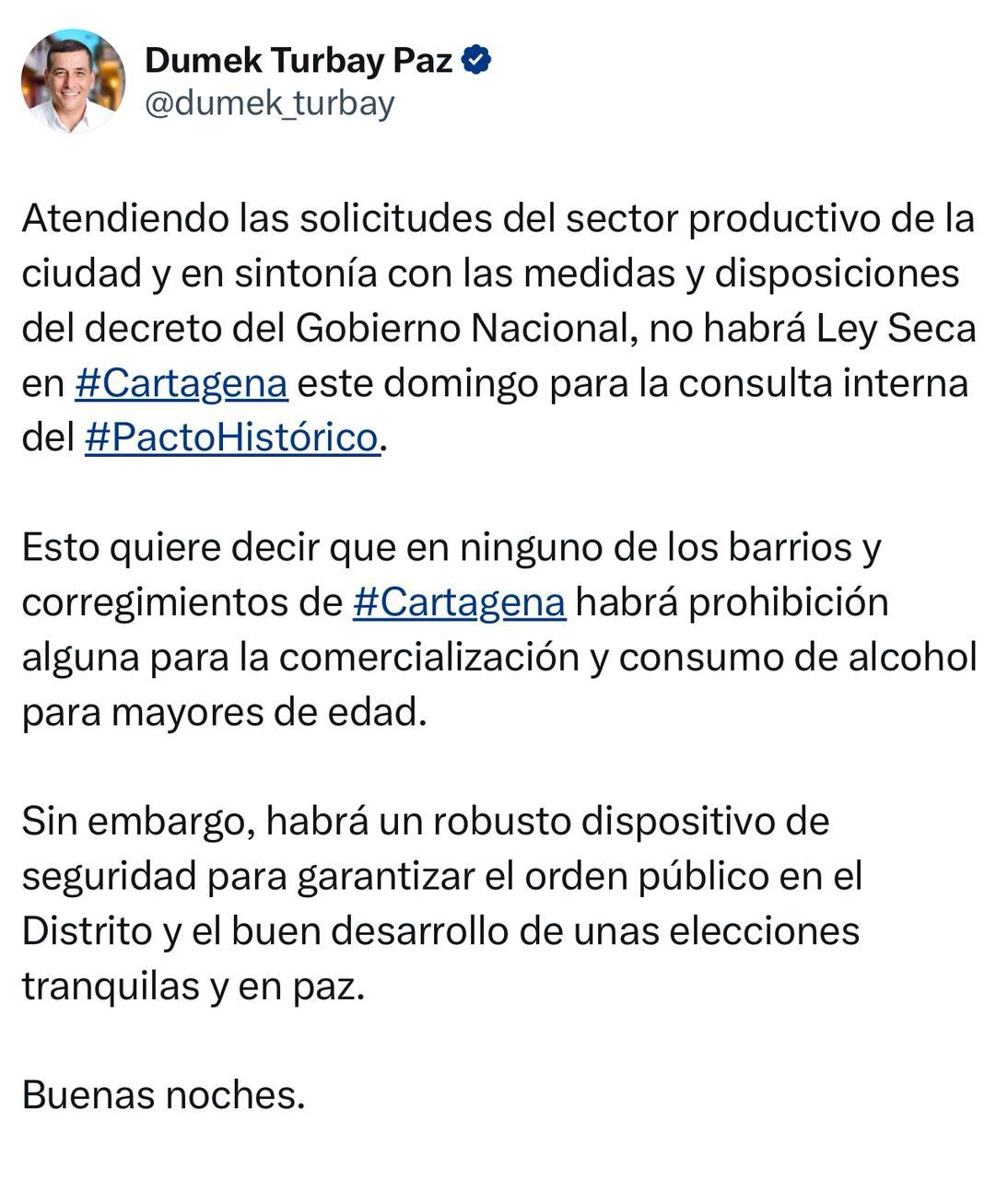 El alcalde de Cartagena, Dumek Turbay Paz, anunció que este domingo no regirá la medida de Ley Seca en la ciudad con motivo de la consulta interna del Pacto Histórico.
