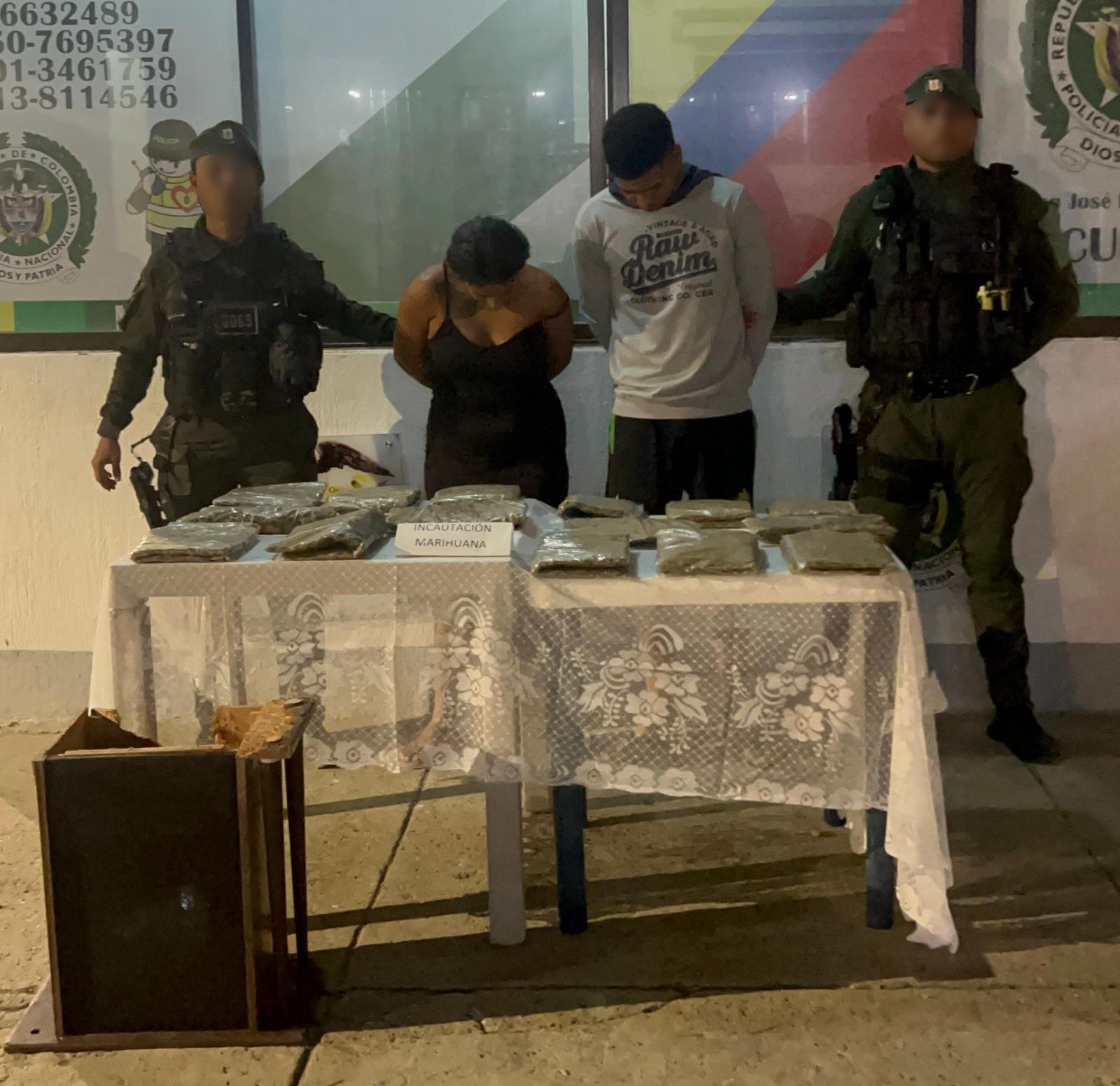 Durante un operativo realizado en el sector Rincón Guapo, del barrio Ternera, la Policía Nacional, con su grupo de ‘Comandos Élites’, interceptó a una mujer conocida como “Tibisay” y un sujeto llamado “Alvaro”, quienes iban por vía pública con un bafle de sonido. Al ser abordados por los uniformados, se tornaron nerviosos, actuando de forma sospechosa, por lo que fue necesario hacer un registro más minucioso de las pertenencias que llevaban, encontrando que, la caja de sonido, tenía en su interior 15 paquetes de marihuana prensada.