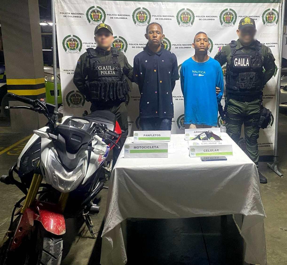 A los detenidos les incautaron 10 panfletos, un arma de fuego, seis cartuchos y una motocicleta.