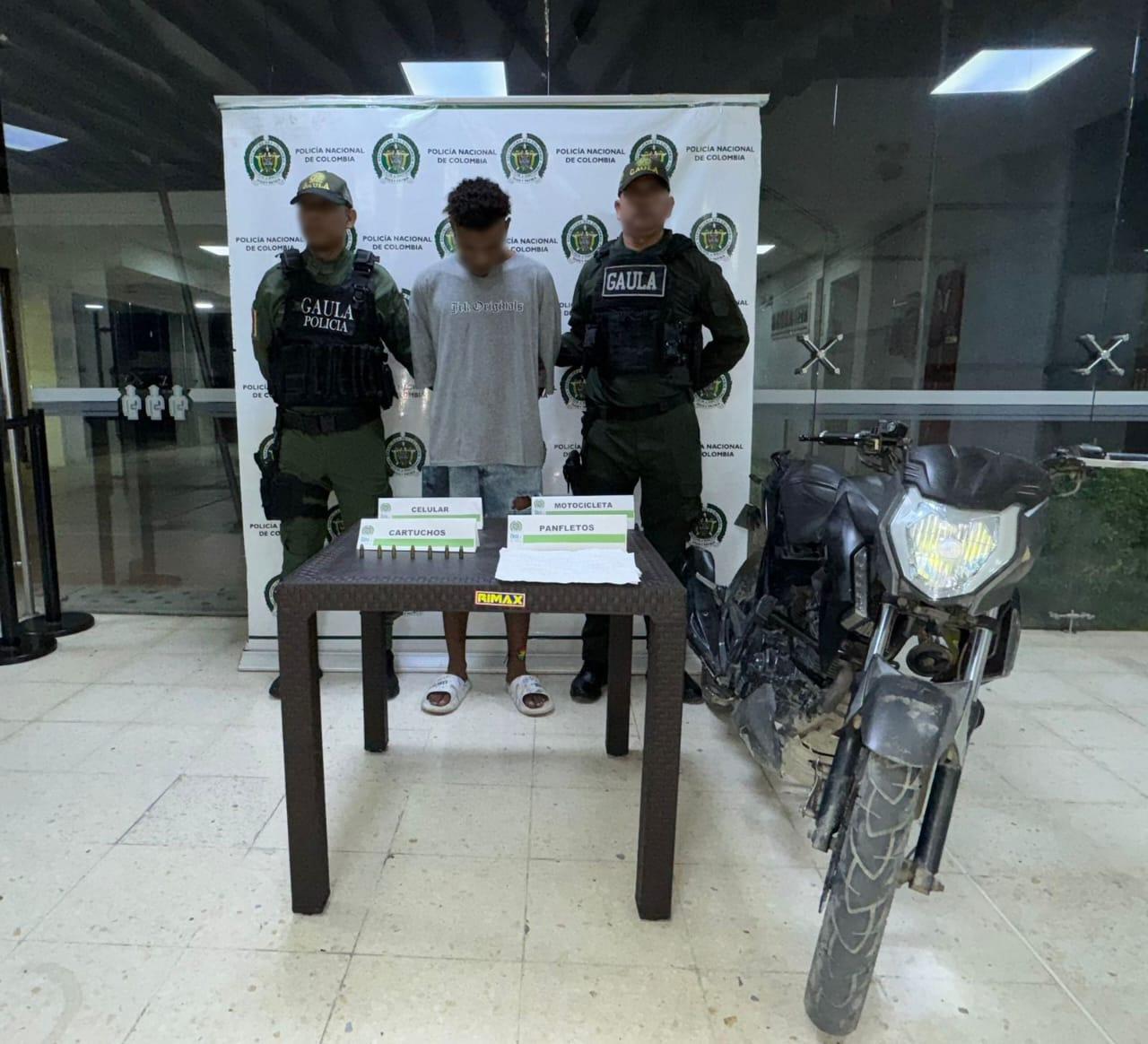 En el segundo operativo, desplegado en la avenida Pedro Romero, del barrio Olaya Herrera, fue capturado “el Jose”, de 22 años, quien se desplazaba en una motocicleta y a quien le fueron encontrados 10 panfletos y siete cartuchos calibre 9 milímetros.