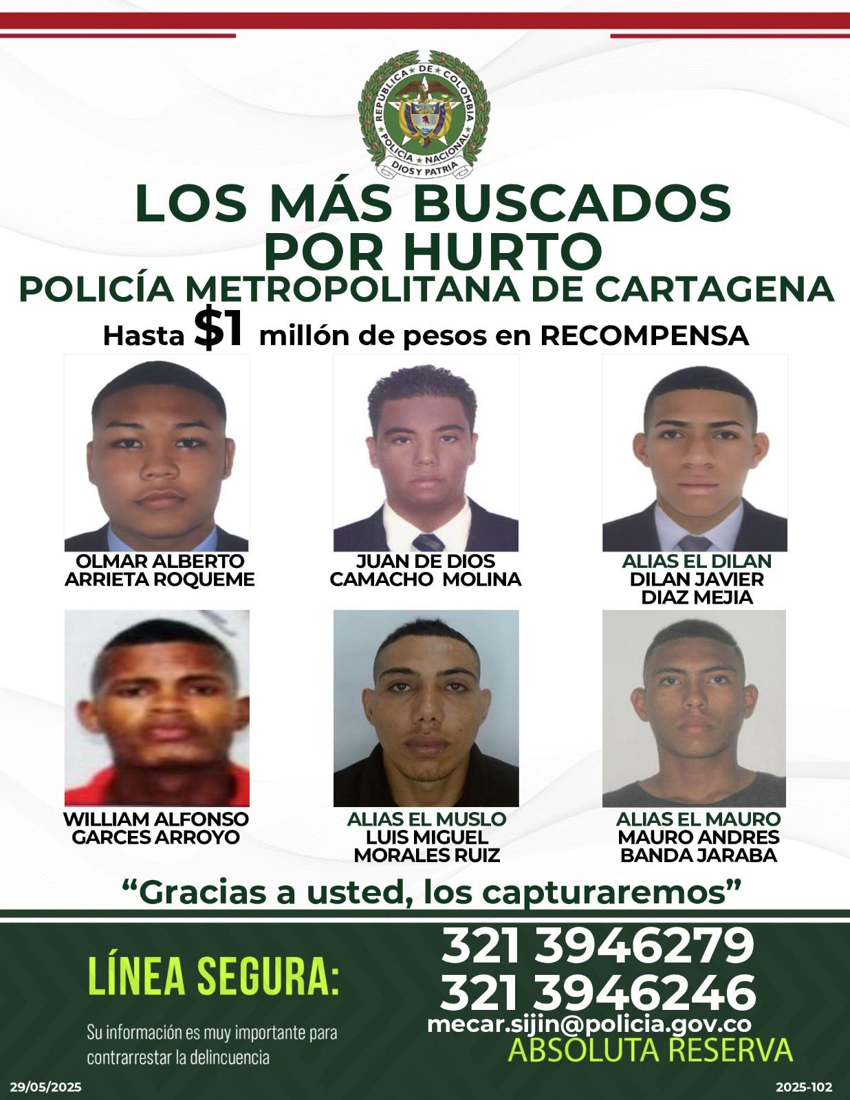 “Queremos decirle a la opinión pública que ofrecemos confidencialidad y absoluta reserva, a las personas que entreguen información de las personas que aparecen en el cartel”, puntualizó el comandante de la Policía Metropolitana de Cartagena de Indias, el señor brigadier general Gelver Yecid Peña Araque.