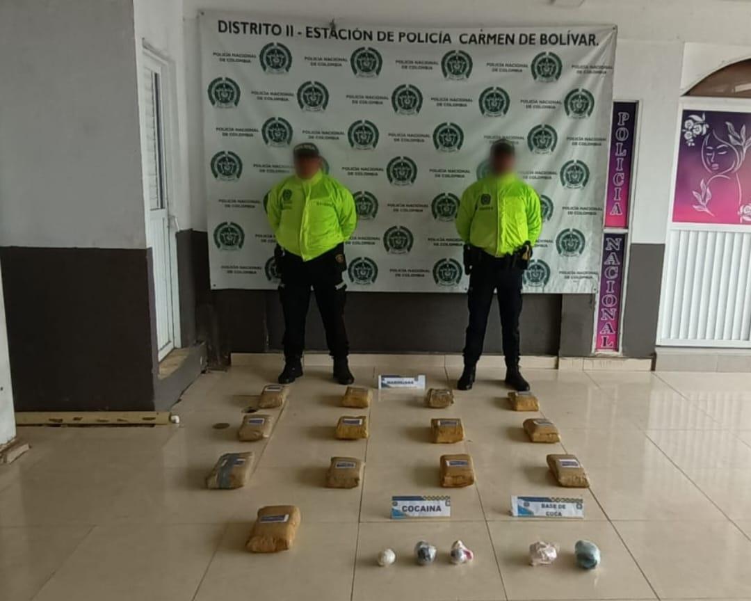 El hallazgo se registró en zona rural del municipio de El Carmen de Bolívar sobre la variante 25 vía Nacional, cuando un ciudadano alertó a la Policía. En total fueron 13 paquetes de marihuana, cinco envolturas de base de coca que equivalen a 567 gramos y 400 gramos de cocaína.