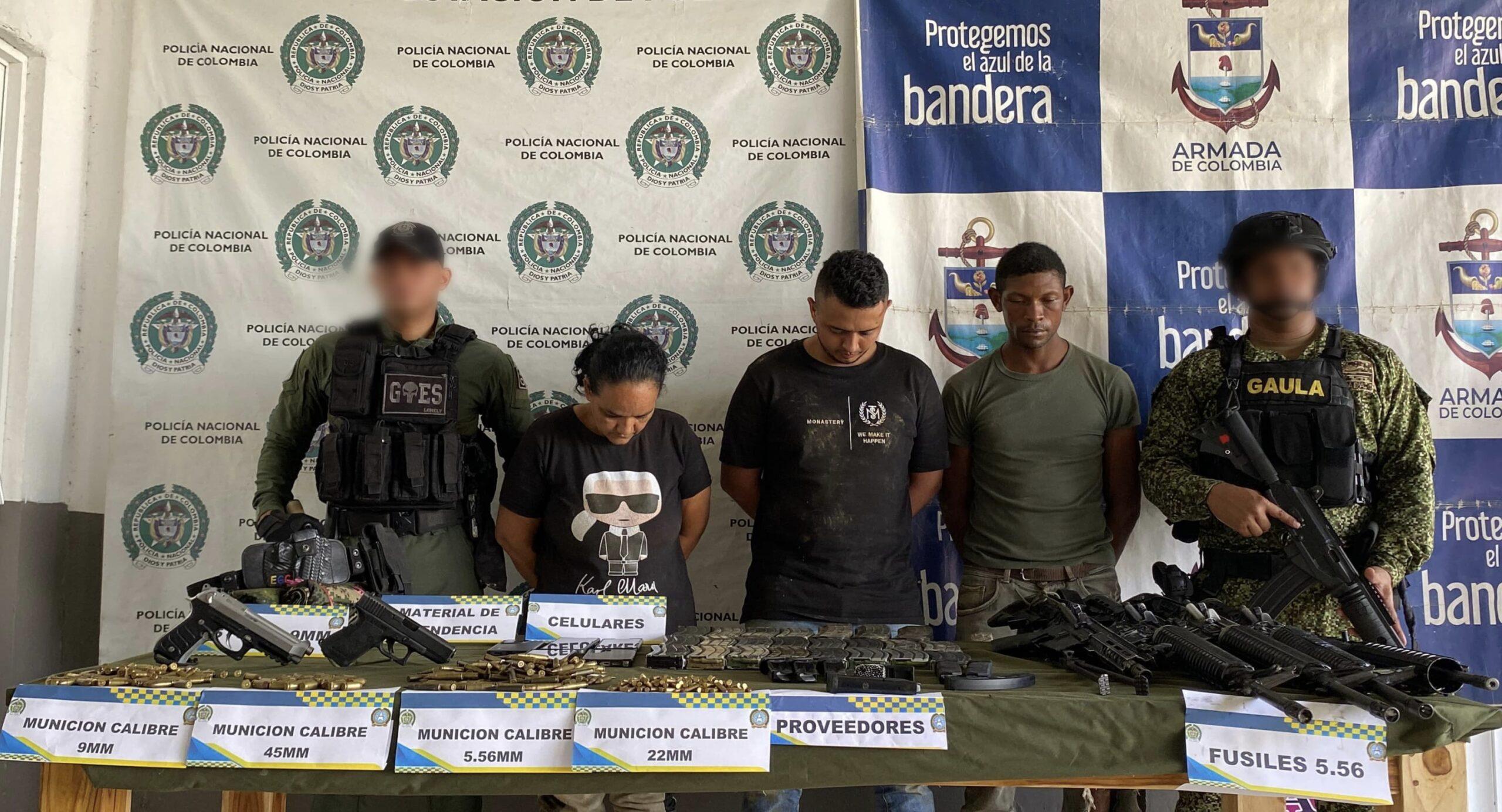 De manera oportuna, y en estricto cumplimiento de las normas del Derecho Internacional de los Derechos Humanos, las tropas ejecutaron maniobras tácticas de reacción y contención en legítima defensa, protegiendo la vida de los uniformados y neutralizando la amenaza. Gracias a esta acción, se logró la captura en flagrancia de tres individuos conocidos con los alias de “Sebastián”, “Candelario” y “María”, señalados por los presuntos delitos de tráfico, porte de armas de fuego y municiones de uso privativo de las Fuerzas Militares.