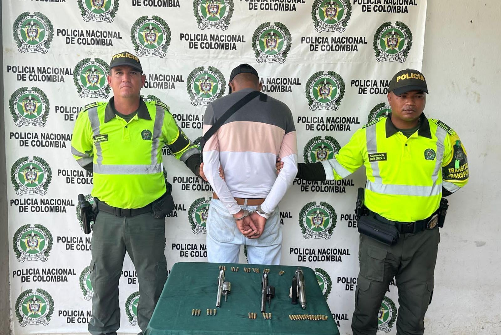 En medio de un operativo de registro y contr por parte de las unidades de la seccional de Tránsito y Transporte, lograron capturar en flagrancia a Juan Manuel Castillo Orozco, de 31 años, oriundo de la ciudad de Bogotá que, en medio de un registro personal, le hallaron tres armas de fuego con sus respectivos cartuchos.