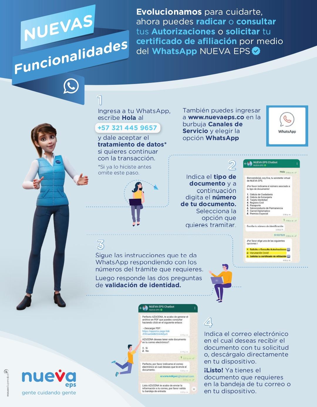 Para facilitar los procesos, evitar desplazamientos y agilizar el servicio, NUEVA EPS ofrece a sus afiliados la posibilidad de generar certificados de afiliación, semanas cotizadas e incapacidad de manera no presencial, a través de su página web www.nuevaeps.com.co y por su línea de atención WhatsApp: +57 3214459657.