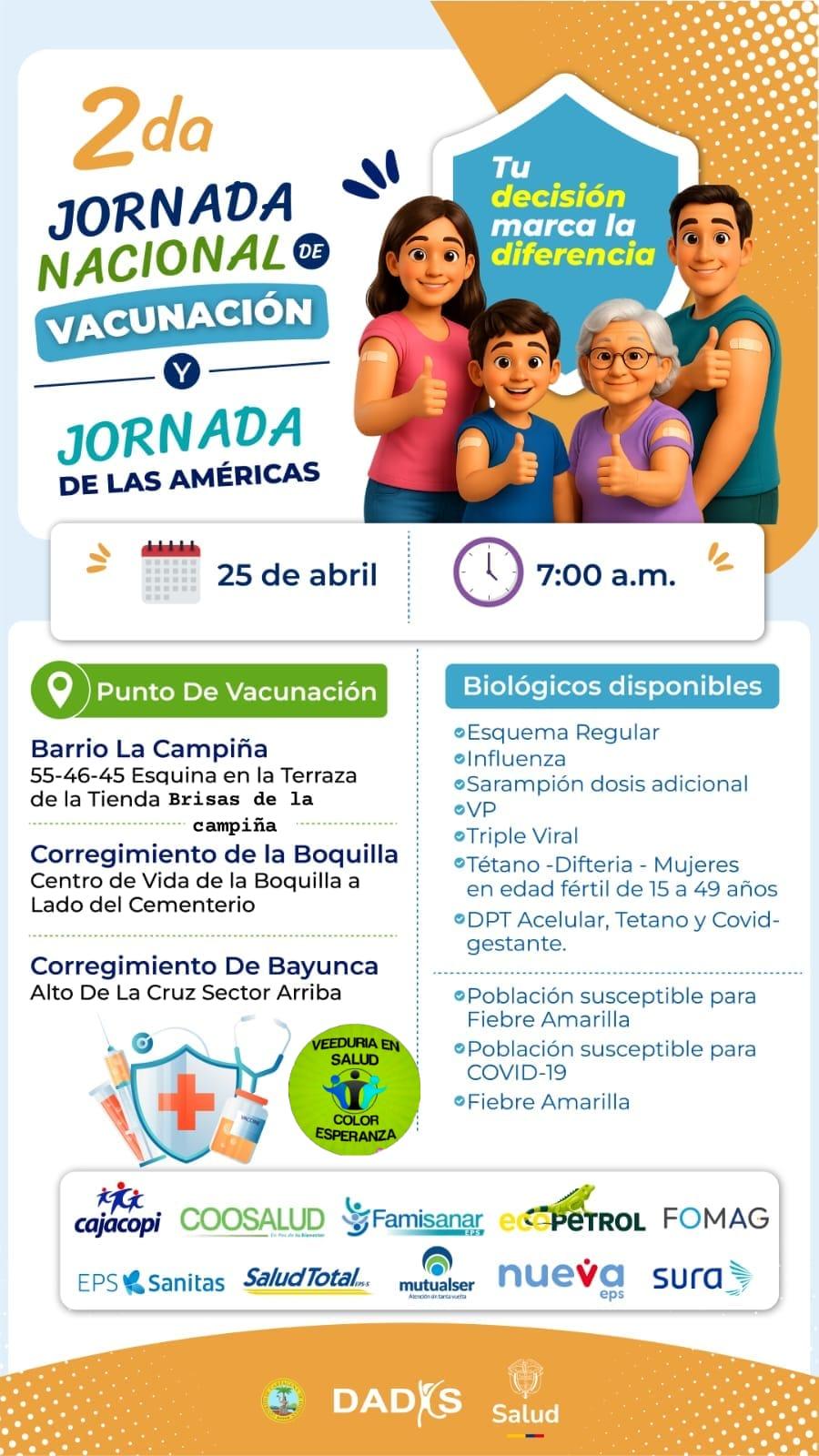 La Veeduría en Salud Color Esperanza, en articulación con el medio Las Noticias Cartagena, invita a toda la ciudadanía a participar en la Segunda Jornada de Vacunación y Jornada de las Américas, que se realizará este sábado 25 de abril de 2026 en el barrio La Campiña y sectores aledaños, evento que es organizado por el Dadis.