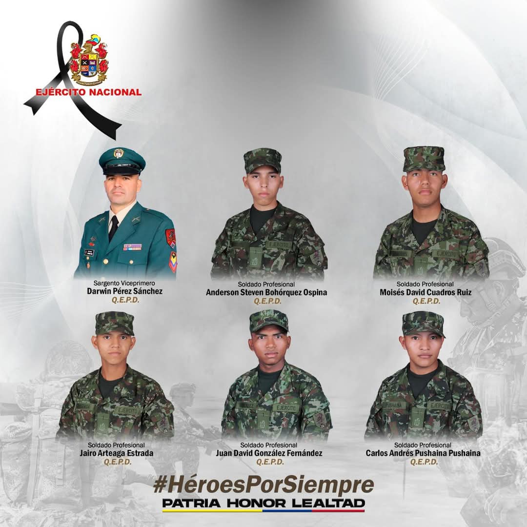 - Al momento, se confirma el asesinato de seis de nuestros héroes, entre ellos el Sargento Viceprimero Darwin Pérez Sánchez y los soldados profesionales Jairo Arteaga Estrada, Anderson Steven Bohórquez Ospina, Juan David González Fernández, Carlos Andrés Pushaina Pushaina y Moisés David Cuadros Ruiz. Además, cinco de nuestros hombres que habían sido secuestrados durante el ataque criminal, fueron entregados a la comunidad de Guanapalo por miembros de este grupo armado ilegal.