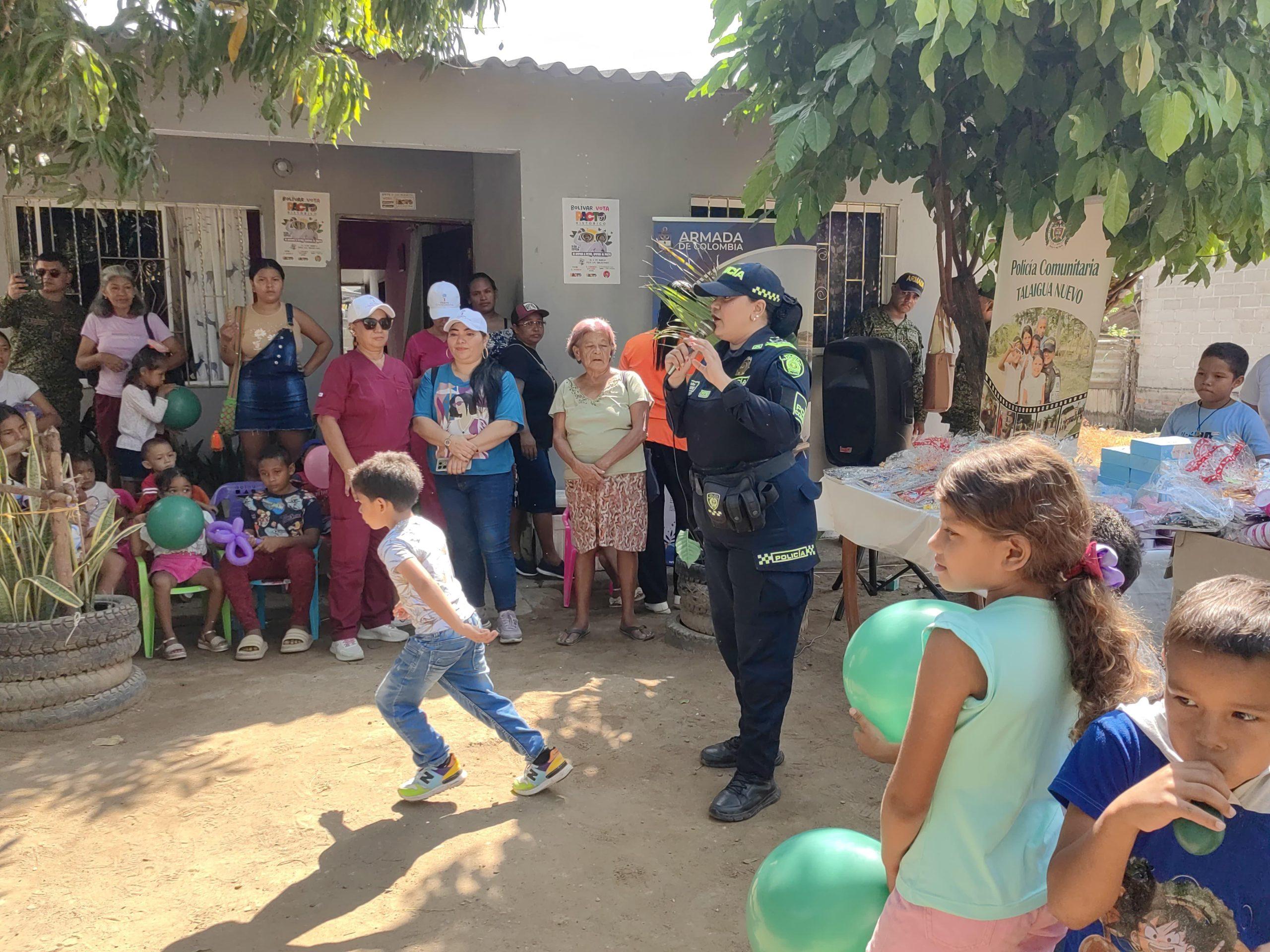 La Policía Nacional de los Colombianos, a través del Grupo de Policía Comunitaria, desarrolló una importante actividad de gestión comunitaria e interinstitucional en el barrio San Martín, del municipio de Talaigua Nuevo, logrando beneficiar a más de 300 niños y familias del sector mediante la articulación con la Armada Nacional, la Fundación Mujeres Emprendedoras, la Comisaría de Familia, el Hospital de Talaigua Nuevo y la Junta de Acción Comunal.