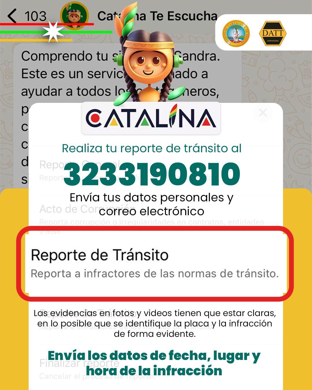 Vehículos mal estacionados, uso del celular mientras se conduce o el irrespeto a las señales de tránsito son algunos comportamientos que ponen en riesgo la seguridad vial y la vida. Por esta razón, la Alcaldía Mayor de Cartagena, a través de la Oficina Asesora de Informática y el Departamento Administrativo de Tránsito y Transporte (DATT), pone a disposición de los cartageneros la posibilidad de reportar infracciones de tránsito mediante la asistente virtual Catalina.